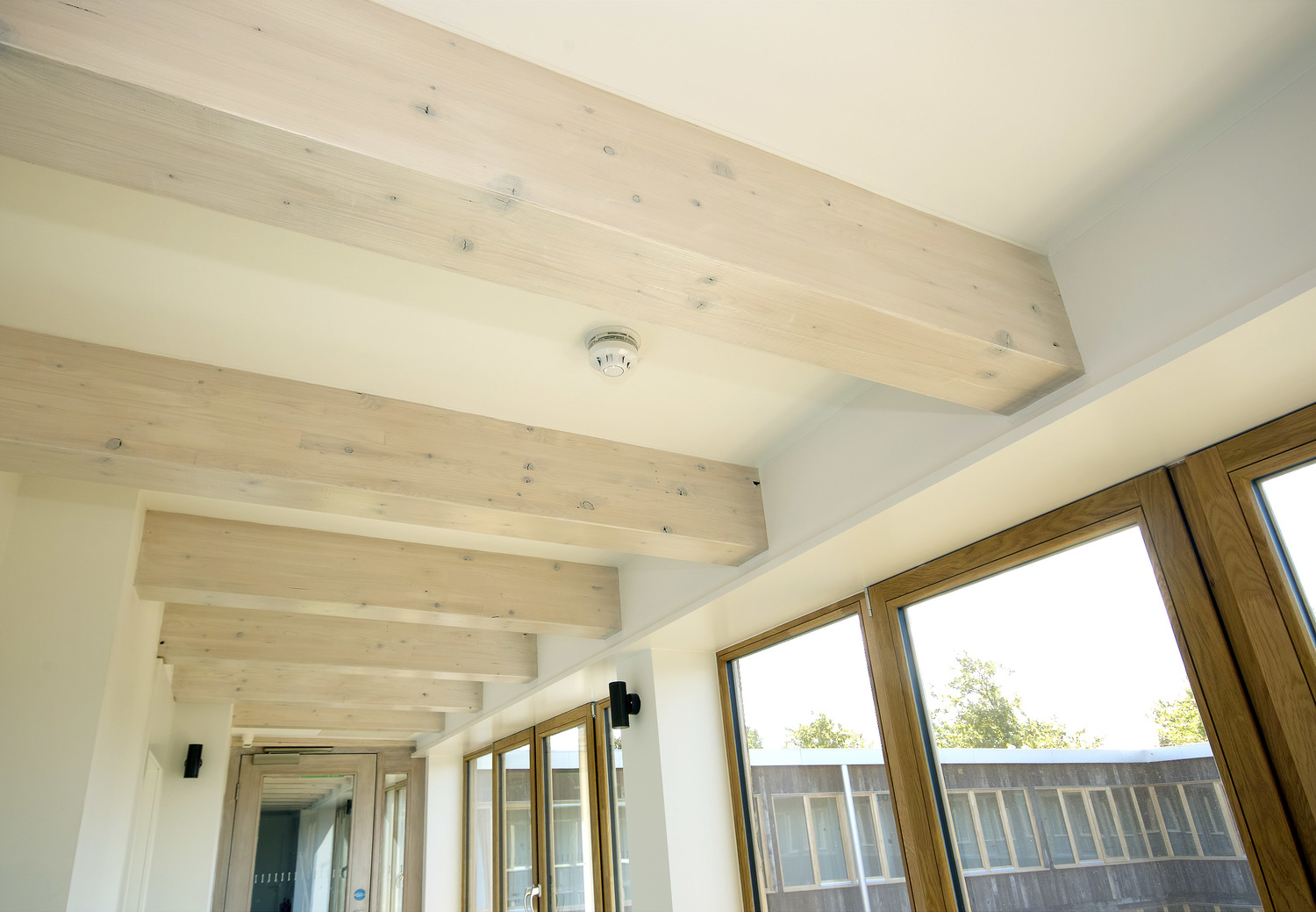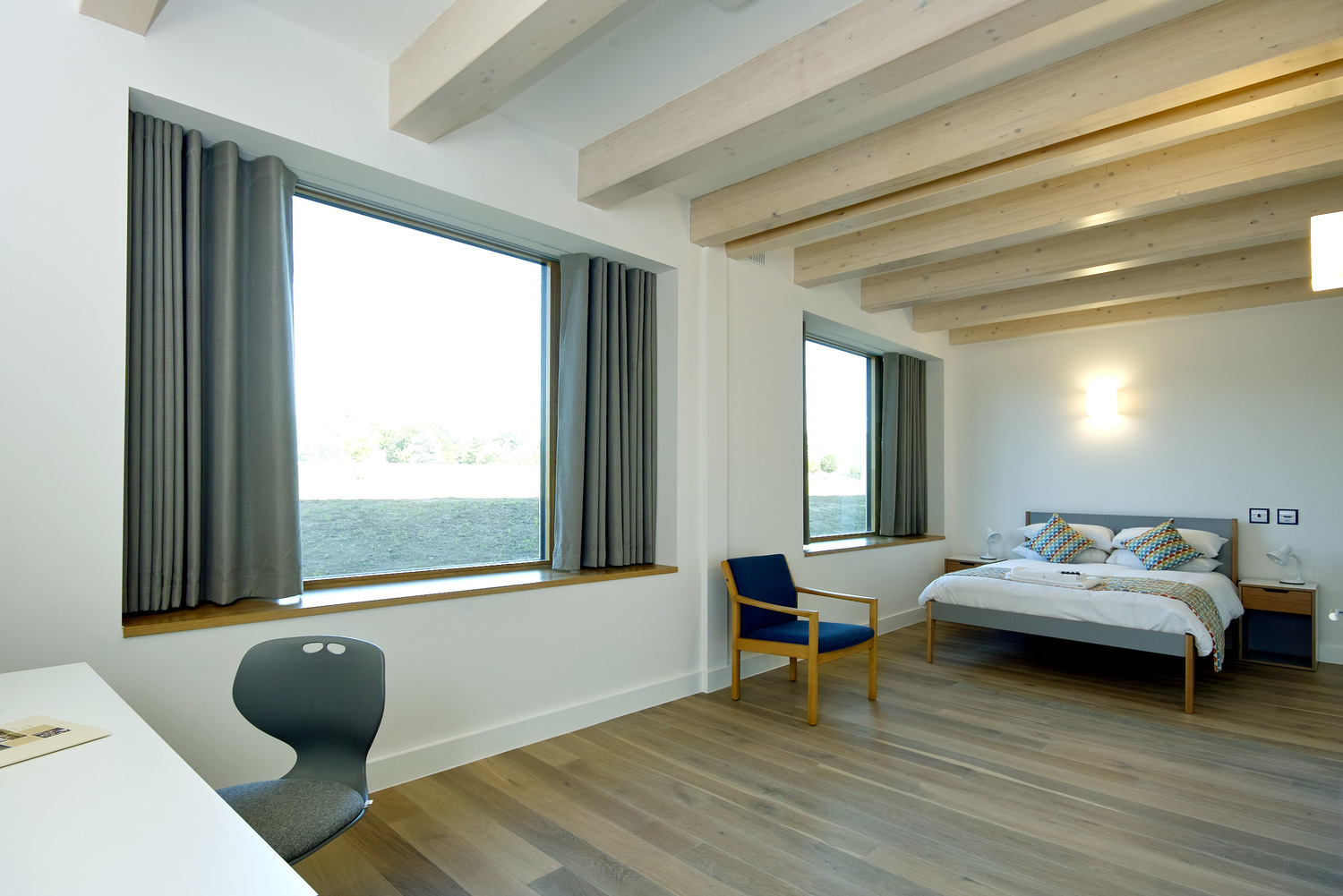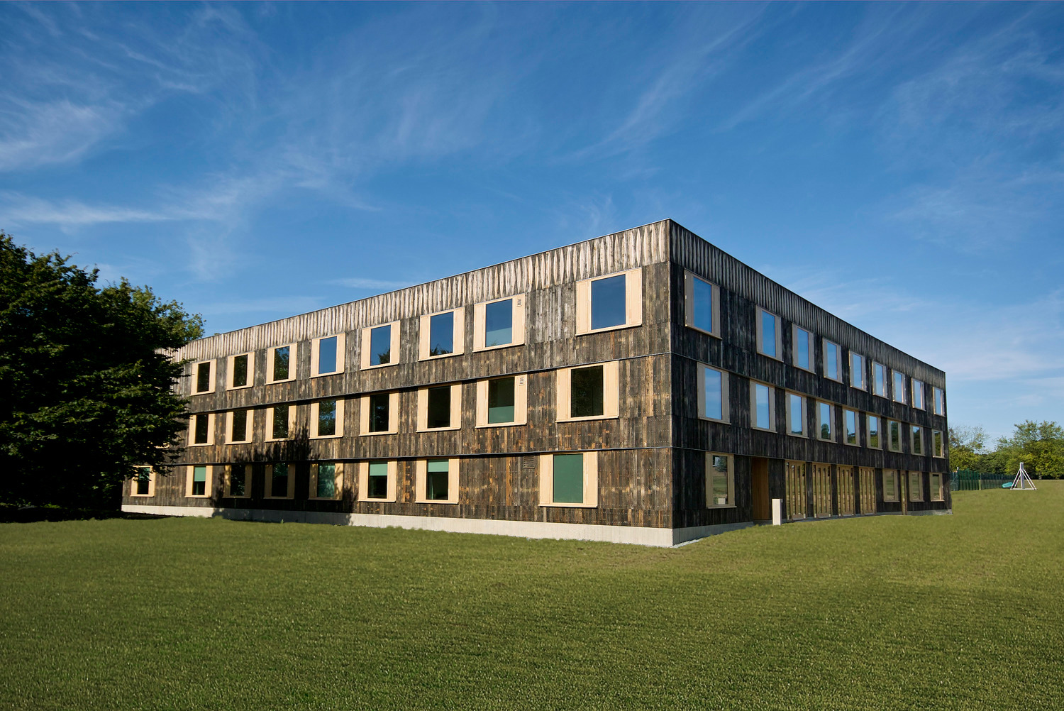 The primary joists are glulam beams, which span from the external to the courtyard façade. In addition, each bedroom features a bathroom pod that was pre-fabricated off-site. However, what makes this project most unique is that the external elevations are clad in reclaimed oak from former French railway carriages.