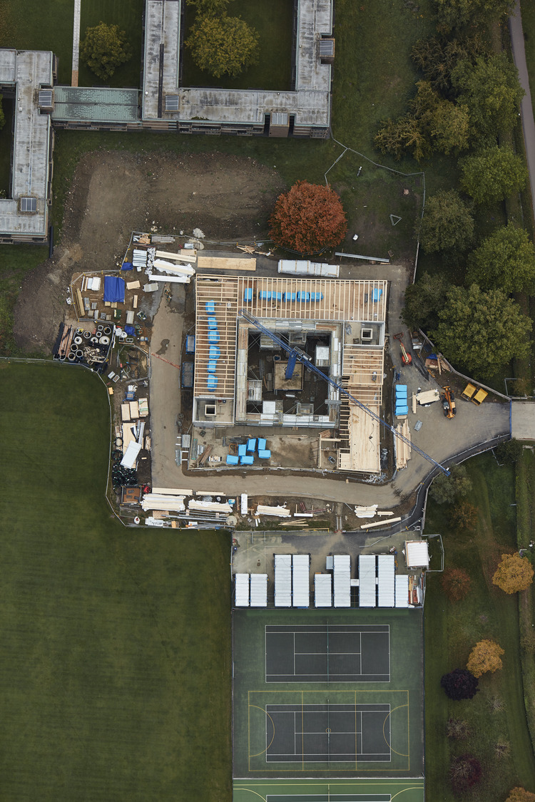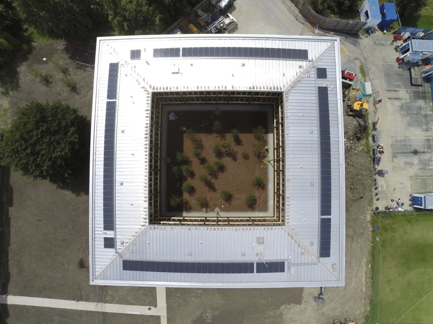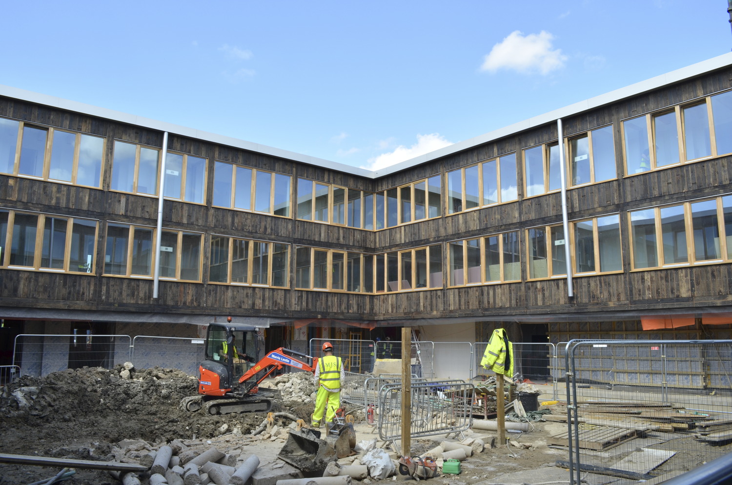 The primary joists are glulam beams, which span from the external to the courtyard façade. In addition, each bedroom features a bathroom pod that was pre-fabricated off-site. However, what makes this project most unique is that the external elevations are clad in reclaimed oak from former French railway carriages.