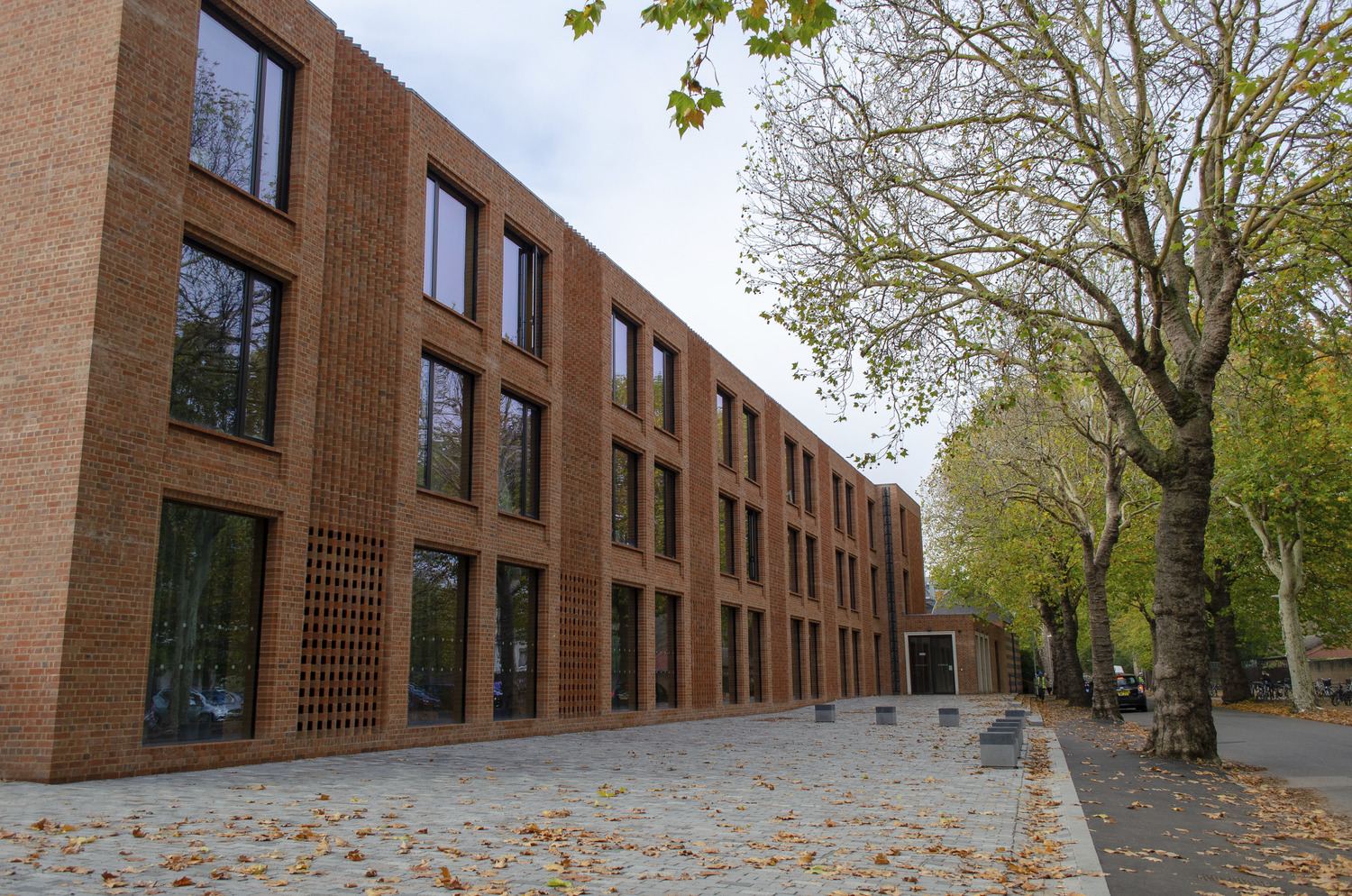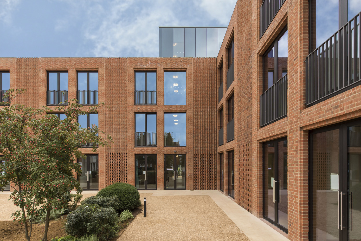Designed to sit between the adjoining Champneys’ buildings, the Architect described the project as a ‘contemporary addition that will provide a dynamic new frontage for Newnham College along Sidgwick Avenue yet does not impose on the historic buildings and gardens.’ Landscape works were therefore integral to the design, with the building wrapping around a new courtyard garden, and carefully considered interstitial spaces improve visual and physical links between buildings.