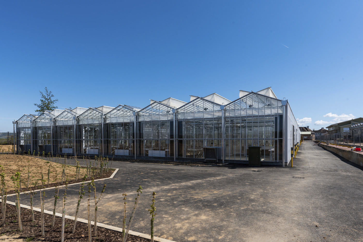 To prepare the site, the initial work comprised the demolition of existing green houses, glass houses, a cold store, and other redundant structures. The facilities buildings constructed in their place includes a reception, office space (including areas for collaborative working), meeting rooms, staff break-out areas and ancillary spaces such as a store and plant room. Facilities Building 1 also provides a new winery, complete with fermentation tanks, a wine cellar, dry goods store, laboratories, and a clean room. The second new building houses cold stores, growth rooms, and a potting facility.