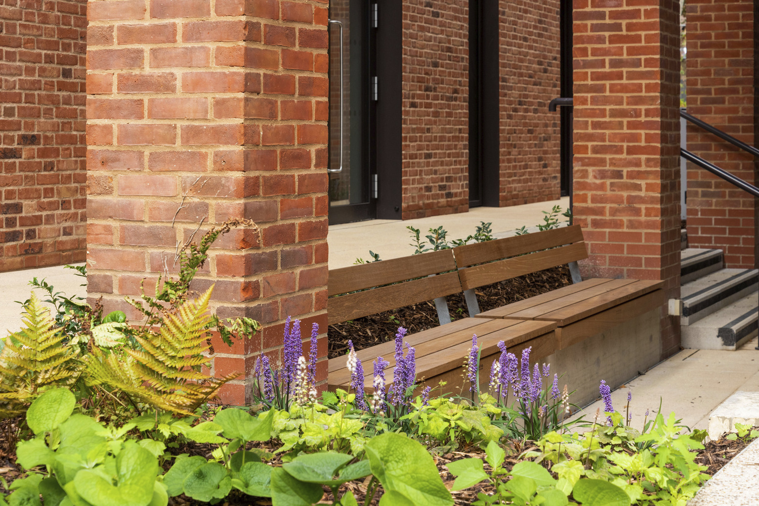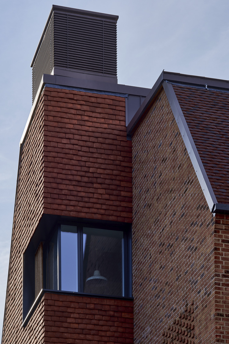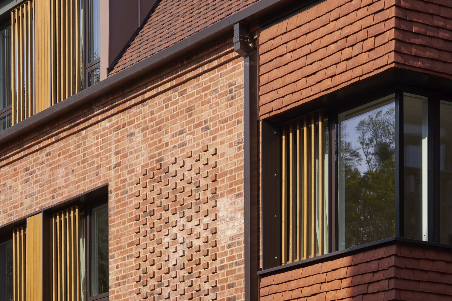 The exterior is a combination of clay tile and timber with lime mortar brickwork to help reduce the embodied carbon of the materials in the façade.