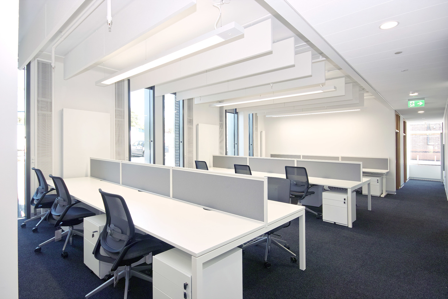 Within the building, the primary spaces are organised on either side of a circulation spine that incorporates the stairs, lift, shared facilities, amenities, and meeting rooms. Horizontal circulation is terminated at both ends by a glazed wall boasting far-reaching views of the adjacent conservation area.